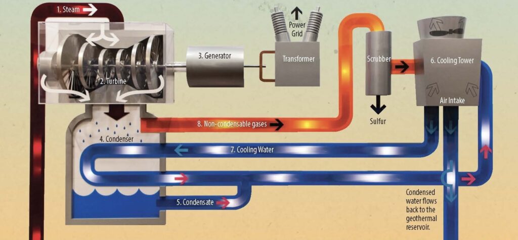 Learn about the key components of a geothermal power plant.